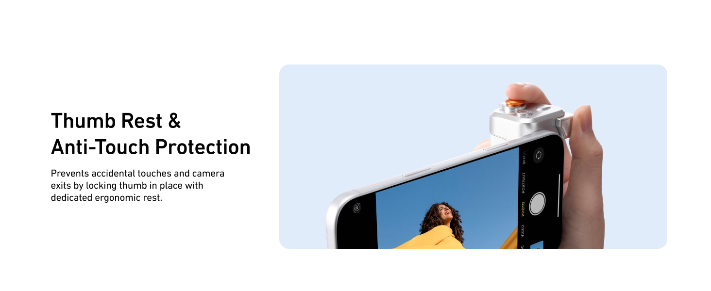 - Precision CNC thumb rest with anti-touch protection keeps your thumb in a dedicated zone, reducing accidental touches that could exit the camera app.