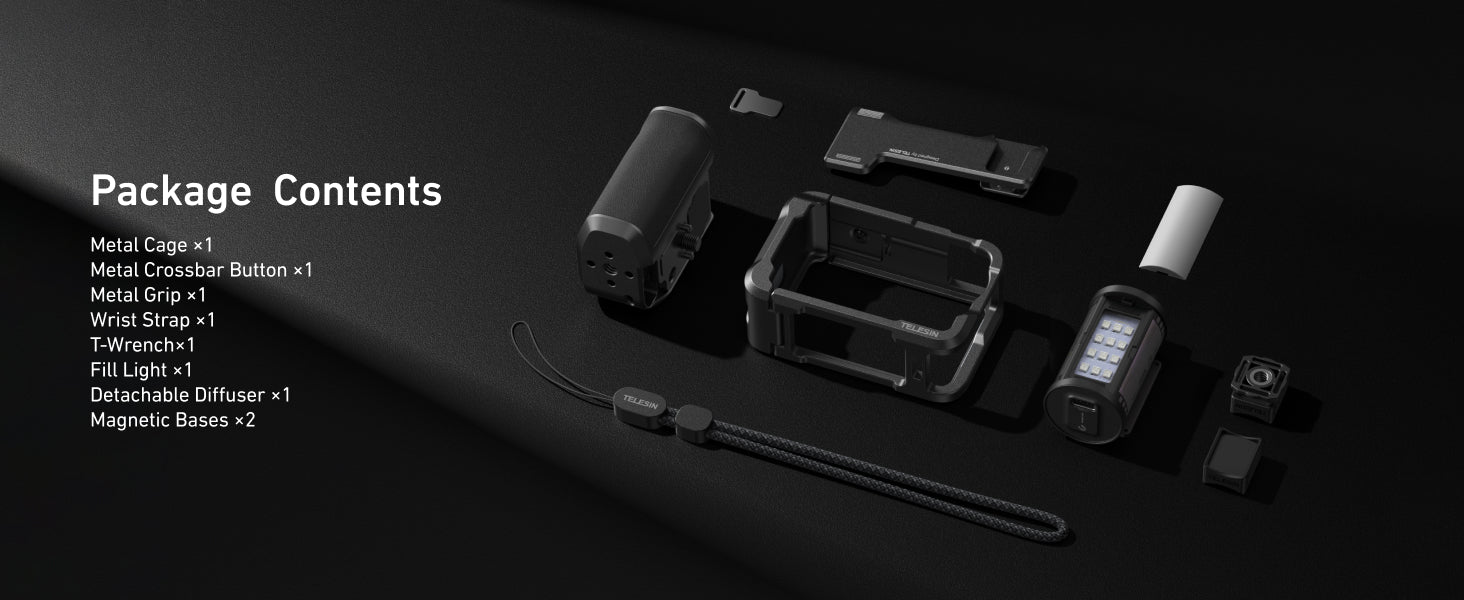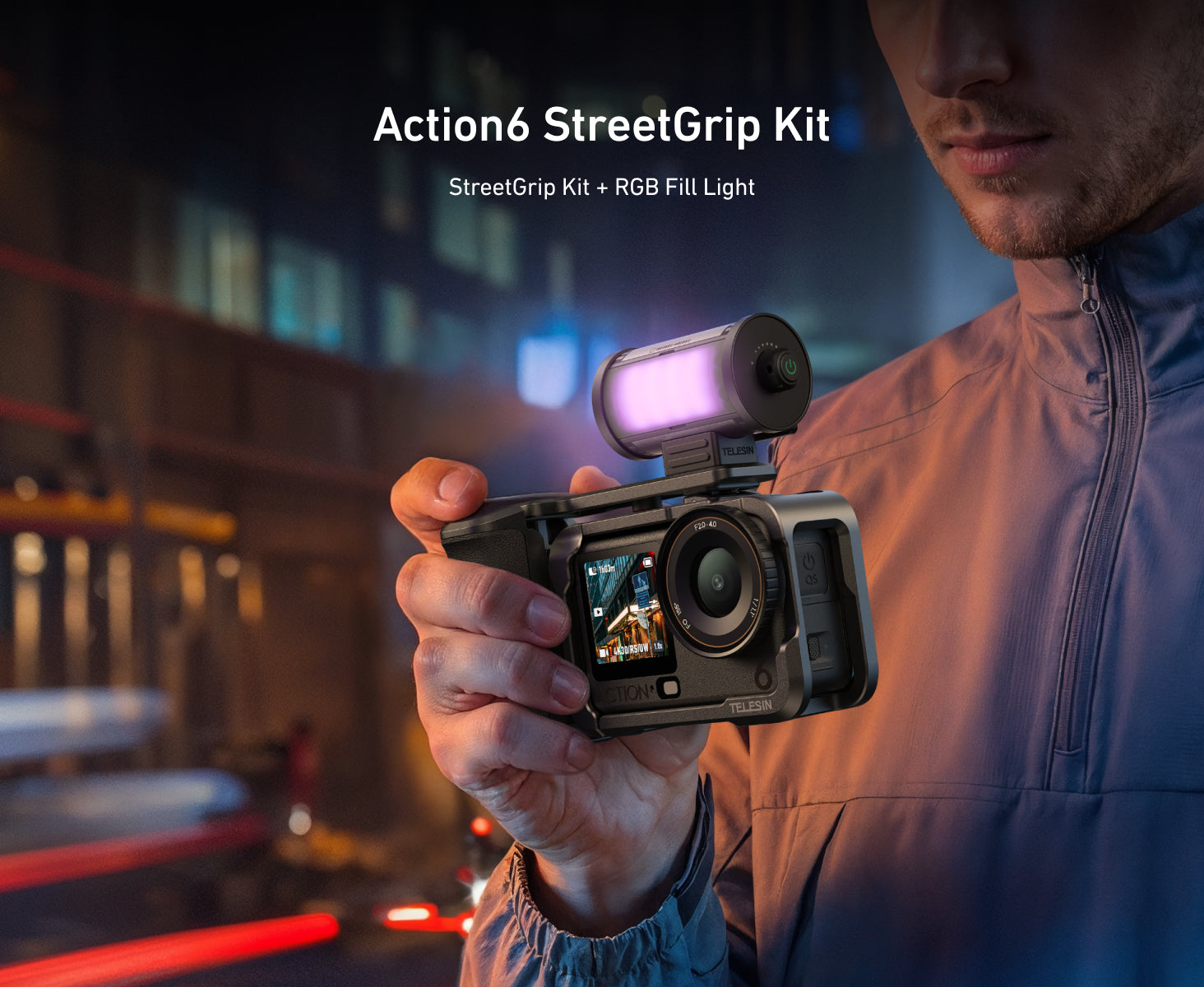 Empower your content creation with the TELESIN Action6 StreetGrip Kit + RGB Fill Light combo. This ultimate kit is designed to ensure you never run out of power and always have perfect lighting, allowing you to focus on creating without limitations. Whether you're vlogging, shooting in low light, or capturing action shots, this kit offers all-day power and professional lighting for every scene.