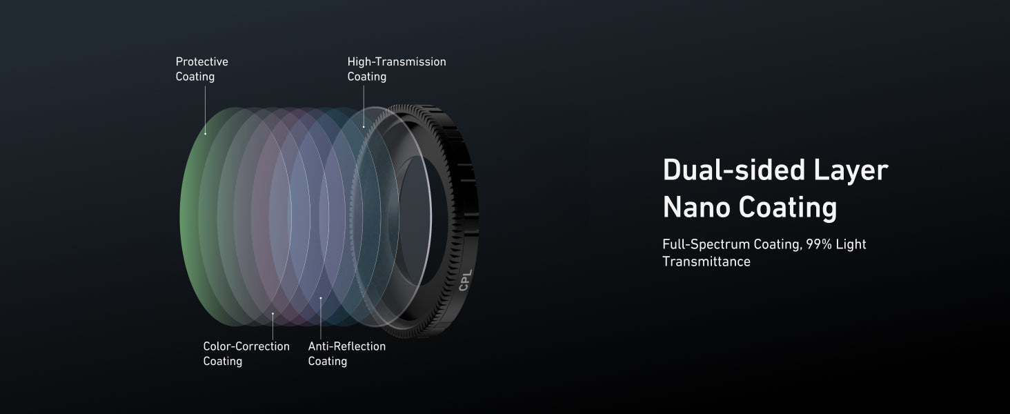 Each filter uses a full-spectrum, dual-sided nano coating stack that includes: