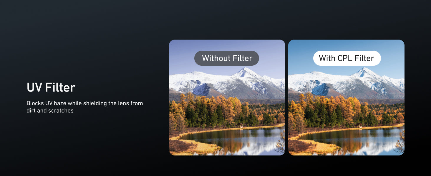 | Without Filter vs With UV Filter | Distant landscapes can look hazy, lens is exposed to dust and scratches. | Distant scenes look cleaner with less haze, while the lens is shielded from daily wear. | Clearer long-distance detail and added protection for the Osmo Nano lens. |