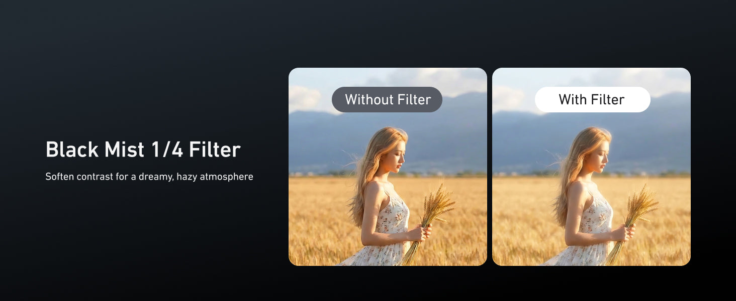 | Without Filter vs With 1/4 Black Mist | High contrast, harsh highlights, clinical or “digital” look. | Highlights gently bloom, contrast softens, and the image feels more cinematic and atmospheric. | A dreamy, storytelling feel with softer, film-like rendering. |