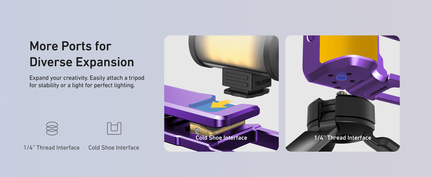 - Clip onto a tripod or clamp without removing the cage