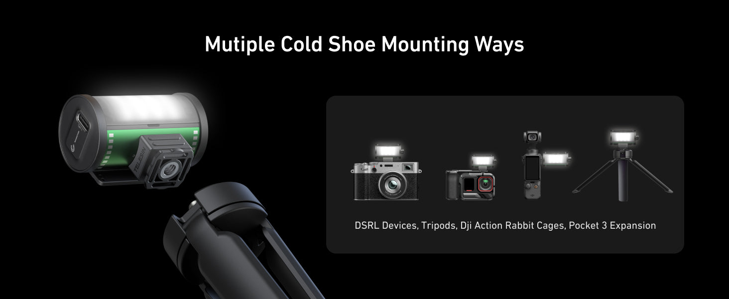 Whether you're using a DSLR camera, tripod, DJI Action Rabbit Cage, or Pocket 3 Expansion, the TELESIN Bi-Color LED Video Light can easily attach to various devices thanks to its multiple cold shoe mounting options. This makes it adaptable to any shooting environment, allowing you to set up quickly and hassle-free.