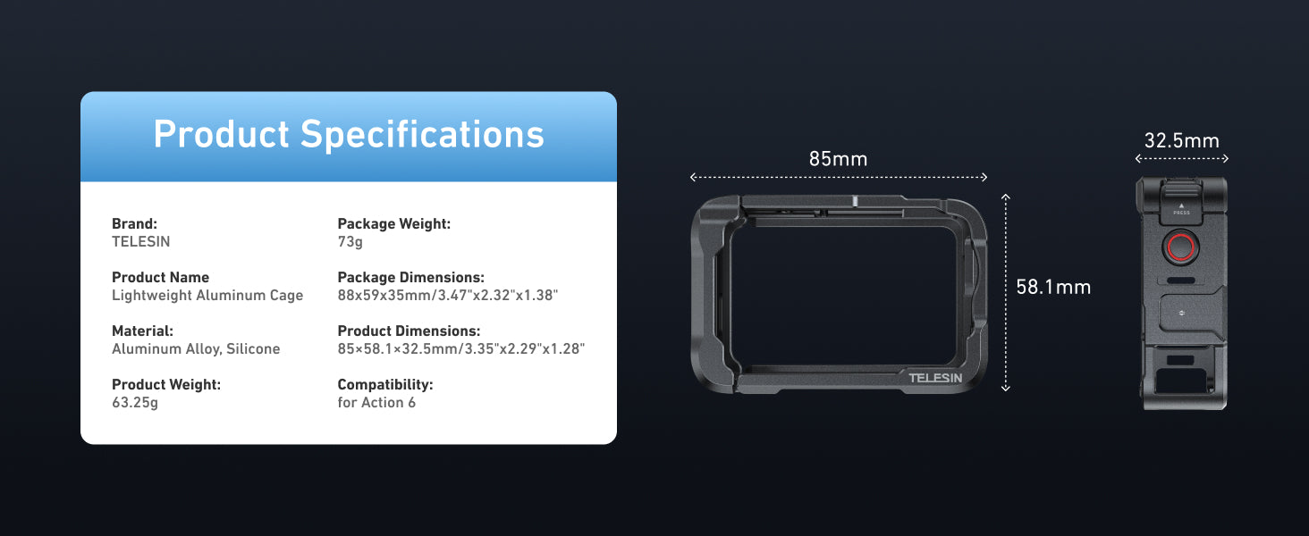 - Premium Protection for Extreme Conditions: Crafted from aerospace-grade aluminum, the TELESIN Metal Cage is designed to withstand harsh environments while keeping your Action 6 protected from drops, impacts, and rough handling. Whether you’re filming in rugged mountains or underwater, this cage ensures your camera is safe and secure, giving you the confidence to focus on your shot.