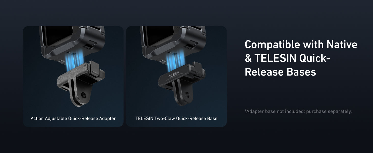 This cage is fully compatible with TELESIN quick-release bases (sold separately), giving you the flexibility to mount your camera quickly on a variety of setups. The adapter base allows you to switch between setups with ease, ideal for different filming situations, whether you're shooting handheld or on a tripod.