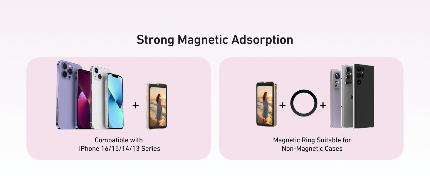 Featuring an innovative magnetic design, the monitor attaches firmly to your phone without any additional stand or device. Even if your phone has no magnetic back, the included metal ring can be attached to your phone or case, ensuring a stable and secure connection that won’t come loose during filming.