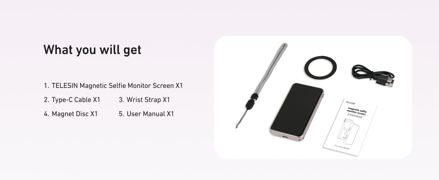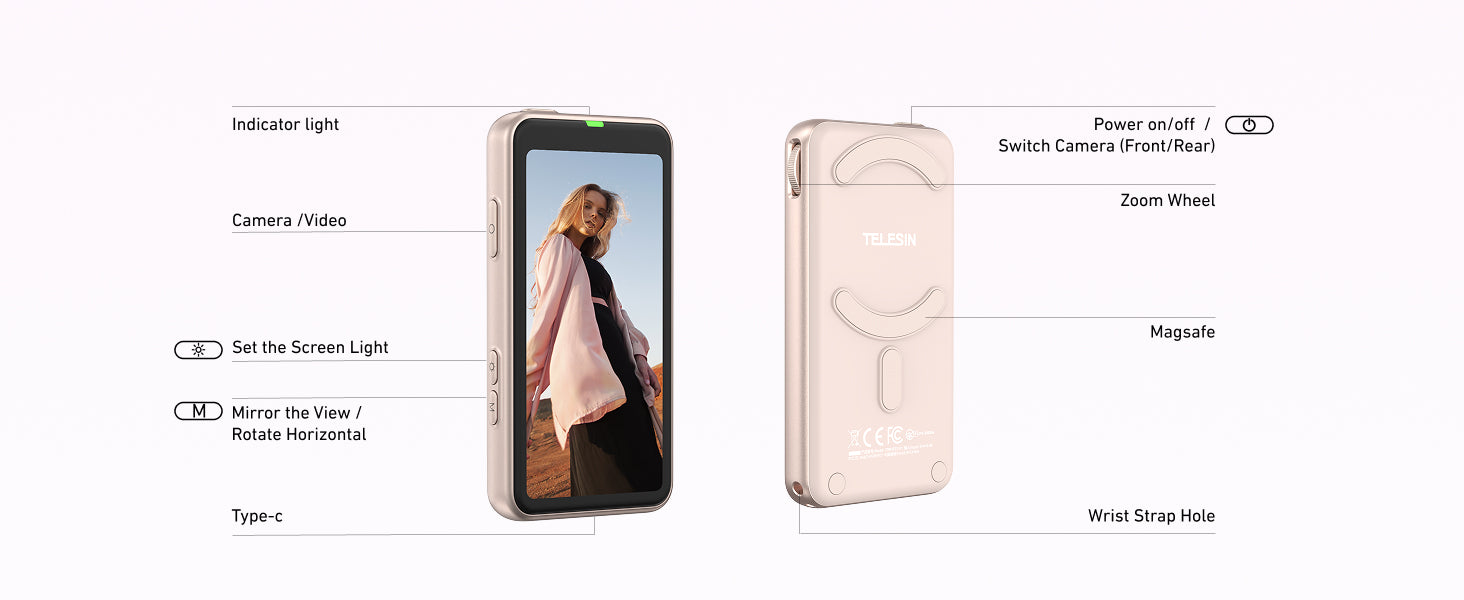 The TELESIN Magnetic Selfie & Vlog Monitor is a wireless, lightweight selfie monitor designed for content creators. By wirelessly connecting to your phone, it provides a real-time preview from your rear camera, helping you easily see yourself and adjust your shooting angles, solving the common issue of not being able to view yourself while shooting. Whether you're vlogging, shooting outdoors, or creating short videos, this monitor ensures the best shooting experience, anytime, anywhere.