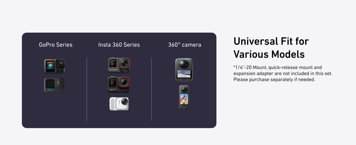 The mount supports a variety of camera models, including GoPro, Insta360, and Pocket 3, providing versatility for creators using different devices. It also fits cameras with a 1/4"-20 thread for additional mounting options.