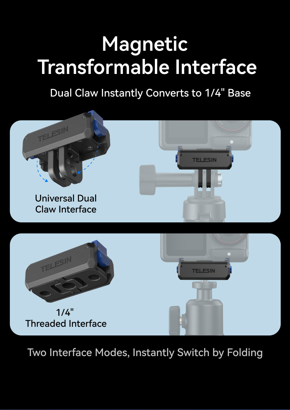 - Universal dual-claw interface – Works with Osmo Action 5/4/3 and other action cameras that use the common dual-prong system.