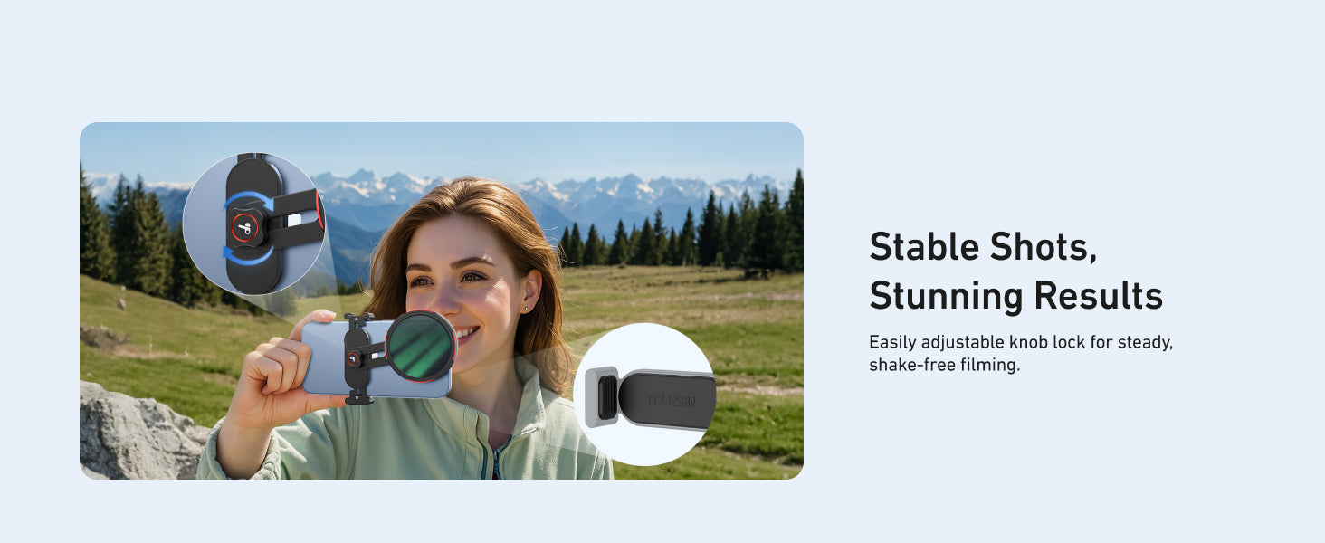 Forget about shaky footage. With the easy-to-use adjustable knob lock, the TELESIN Phone Filters Mount ensures a stable filming platform, even in dynamic or outdoor environments. Capture smooth, high-quality content with ease.