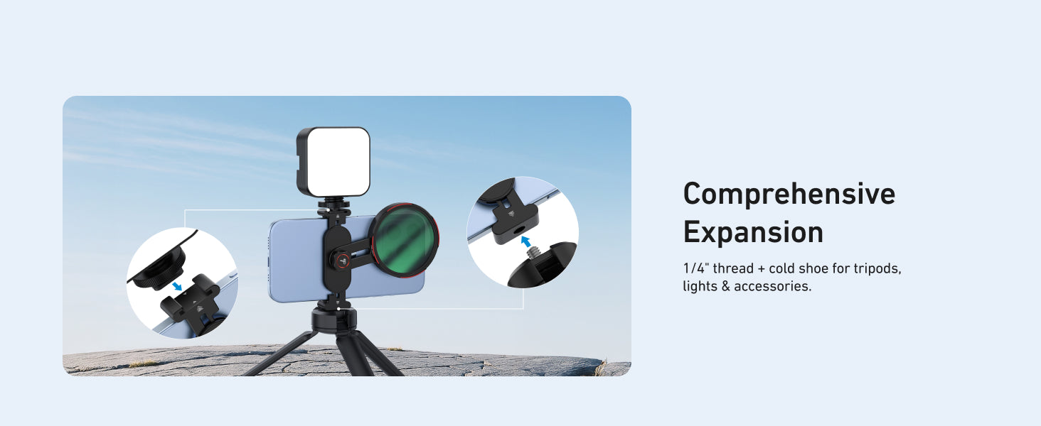 For added versatility, the TELESIN Phone Filters Mount comes with a 1/4” thread and cold shoe, allowing you to attach tripods, lights, microphones, and other filming accessories for a professional setup.