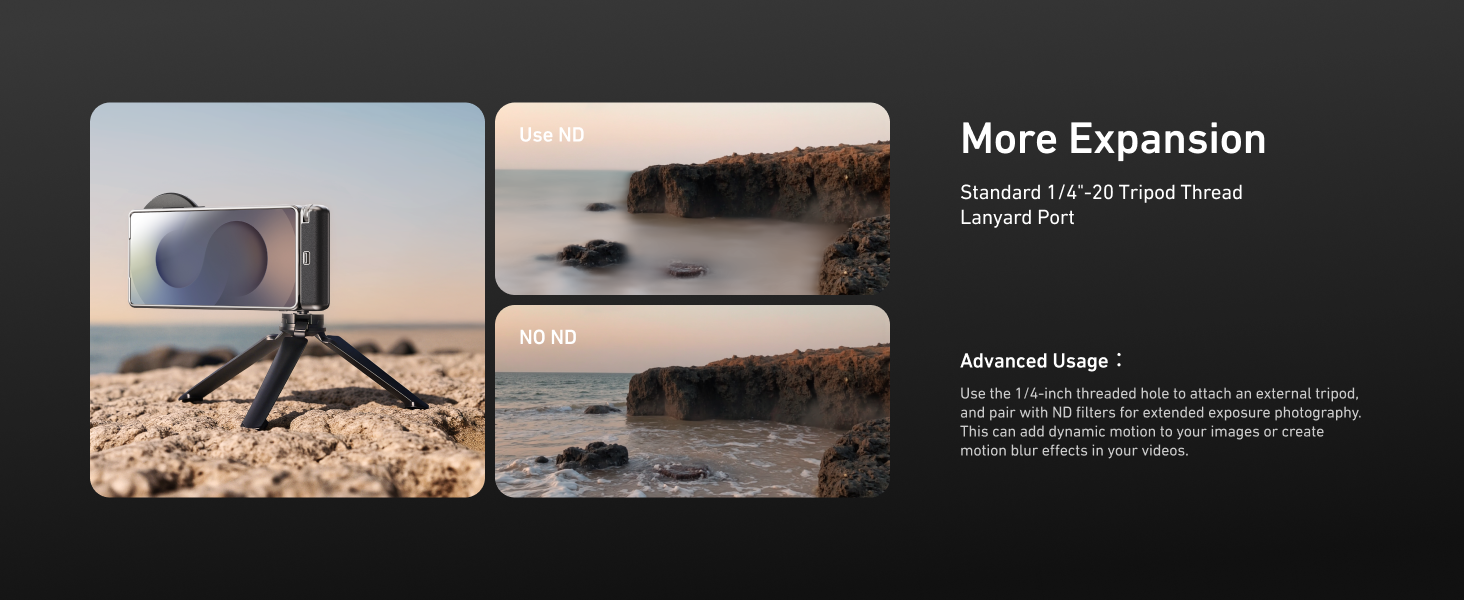 Easily attach your phone to a tripod for stable, long-exposure shots or mount it on other accessories to enhance your mobile photography setup. Whether you're shooting stationary subjects or capturing motion, the 1/4"-20 threaded hole offers versatility in your shooting setup.