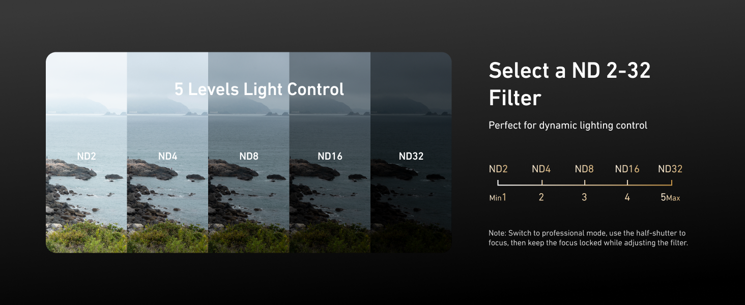Enhance your photos and videos with ND filters (ND2-ND32). Adjust your exposure for perfect lighting, whether you're shooting in bright daylight or creating a dramatic effect in low light. These filters provide precise control over your image’s brightness, enabling professional-level creative effects. Switch to professional mode for precise control during your shoot.