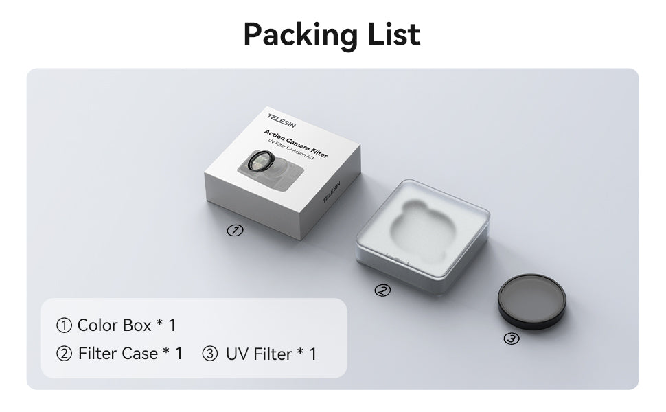 For this UV Protection Lens Filter, TELESIN combines Schott optical glass, aluminum alloy frames and silicone protection layers to balance optical quality and mechanical strength. Each batch is tested for transmission, color consistency and fit on DJI Osmo Action 4/3, so that you get a filter that performs well in both the lab and in real-world shooting.