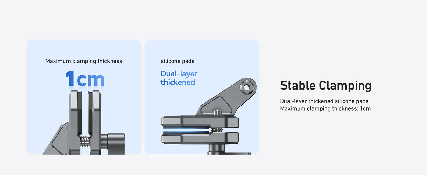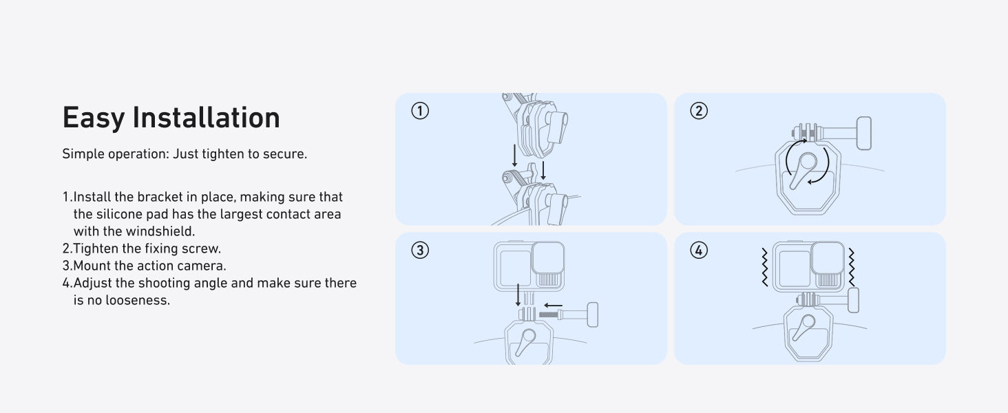 Installing the TELESIN Windshield Clamp Mount is quick and straightforward. The clamp is designed for effortless operation: simply tighten the screw to secure it in place. The silicone pad ensures maximum contact for a secure grip, preventing slippage during use.