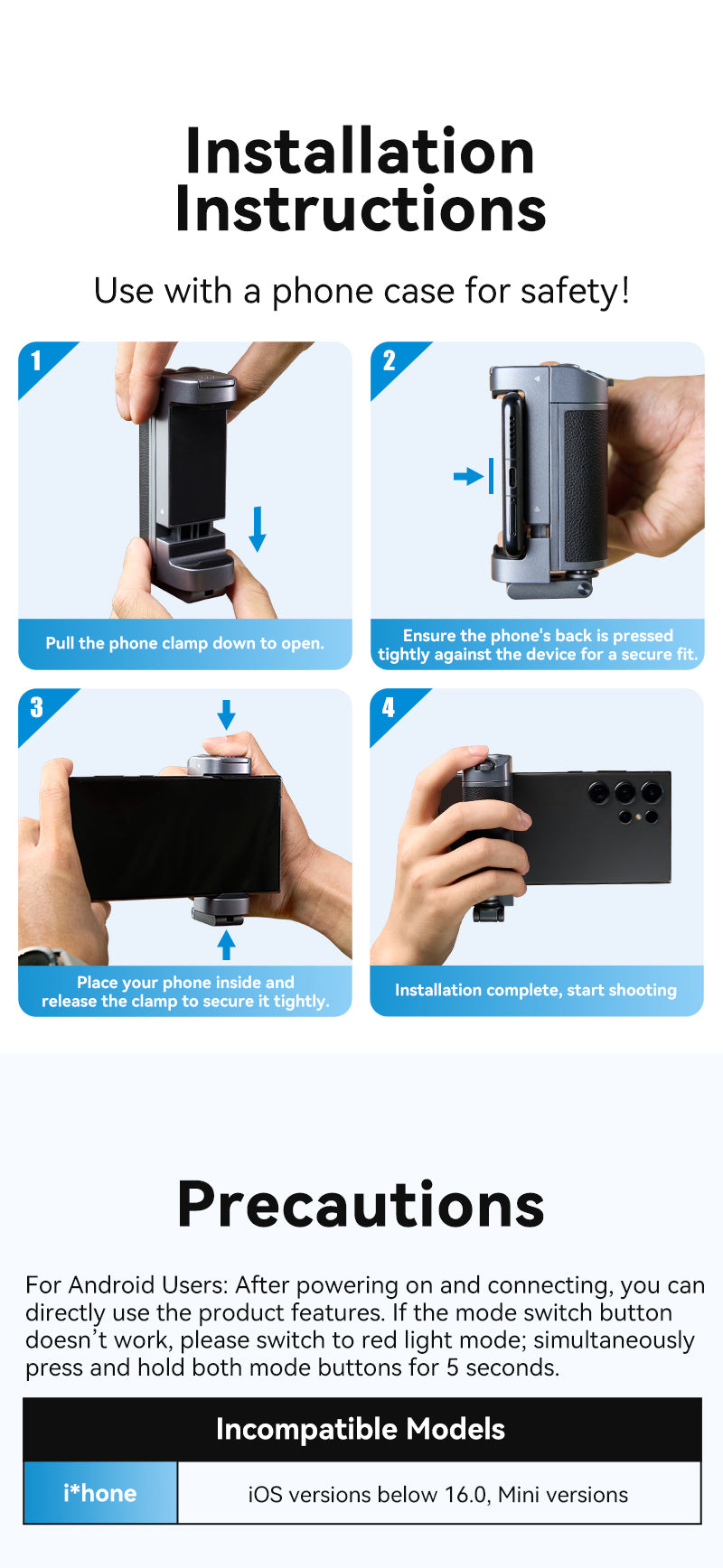 Widely compatible, fully adaptable, 65-90mm clampable range, adaptable to more than 99% of mobile phones.