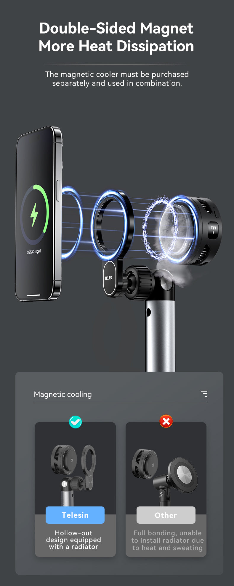5.At the same time, the radiator can be magnetically attracted to the back of the magnetic ring to dissipate heat or charge the mobile phone. All three brackets can be used.