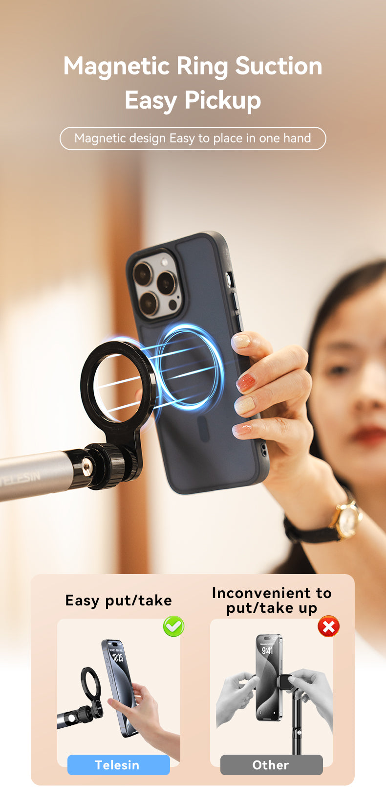 2.The magnetic ring magnetically attracts mobile phones, making it easier to take and place.