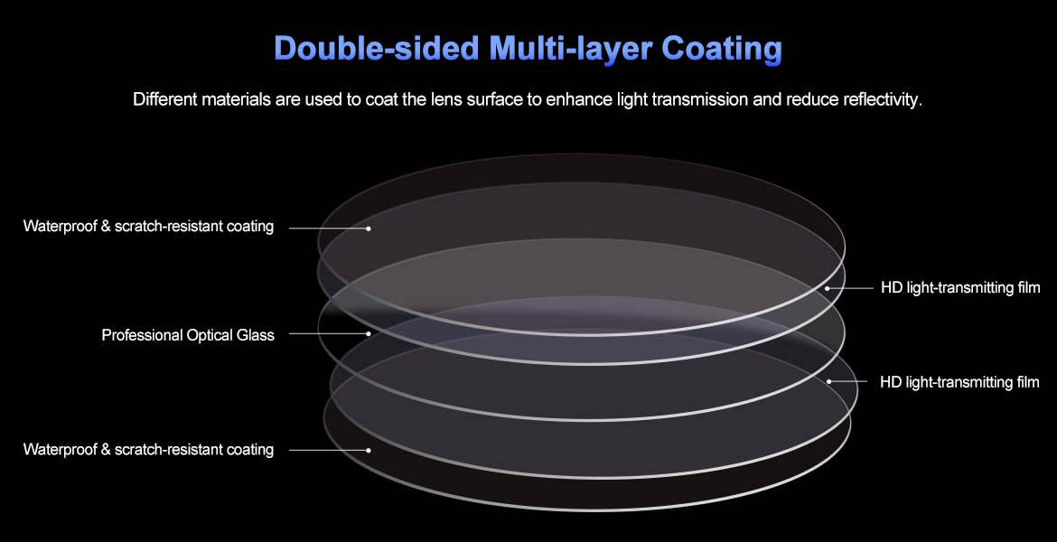 2. Double-sided Multi-layer Coating, upgraded effectiveness, different materials are used to coat the lens surface to enhance light transmission and reduce reflectivity.