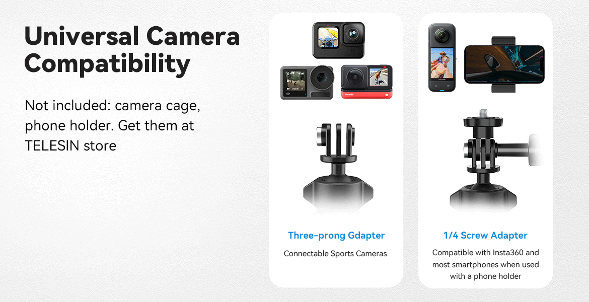1. Three-claw and 1/4 screw dual interfaces can be used to expand action cameras, panoramic cameras, and mobile phone clips;