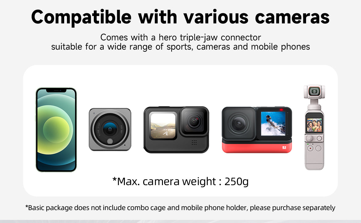Compatible with GoPro, DJI, Insta360, and other brands of action cameras and mobile phones. (The fixed adapter of the product is a three-claw adapter. If you need other adapters, please purchase them separately)