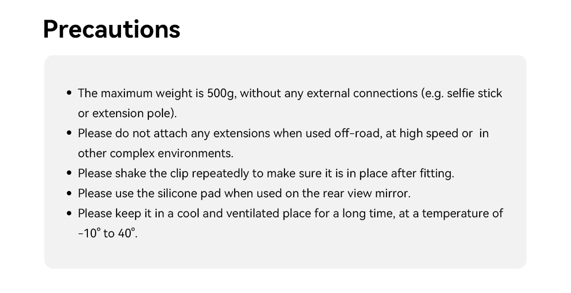 1. The maximum weight is 500g, without any external connections (e.g. selfie stick or extension pole). Please do not attach any extensions when used off-road, at high speed, or in other complex environments.