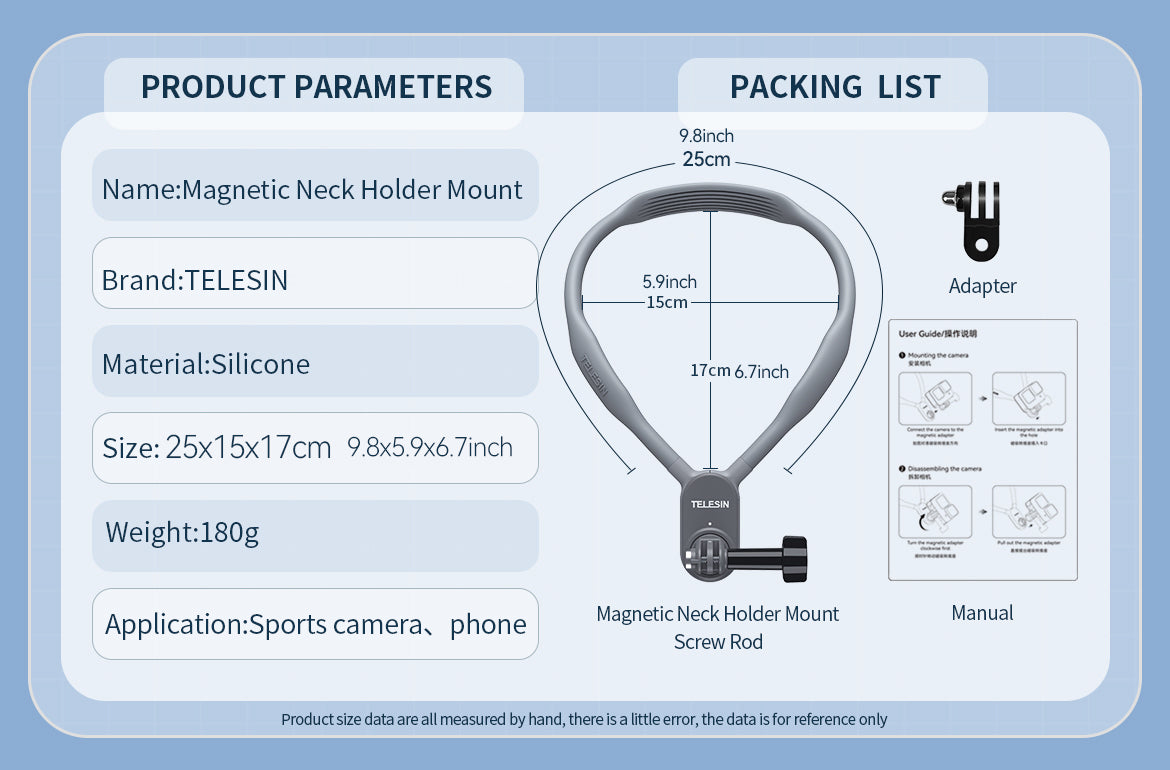The TELESIN Magnetic Neck Holder Mount provides you with a hands-free filming experience that allows you to enjoy immersive, point-of-view shots while keeping your camera steady. The strong magnetic interface and adjustable angles make it perfect for both casual and professional use.